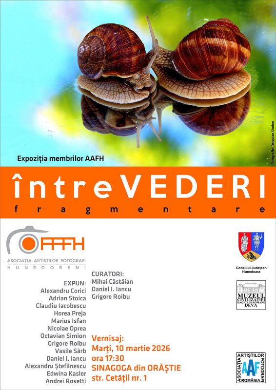 Asociaţia Artiştilor Fotografi Hunedoreni (AAFH) vă invită, marți, 10 martie 2026, începând cu ora 17:30, la vernisajul expoziției „ÎntreVEDERI fragmentare”.