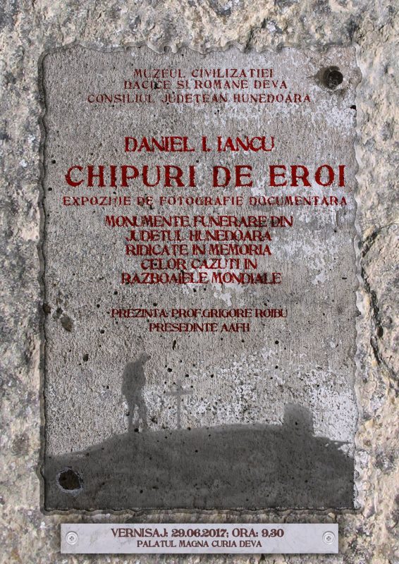 Muzeul Civilizaţiei Dacice şi Romane Deva, cu sprijinul Consiliului Judeţean Hunedoara, organizează în perioada 29-30 iunie 2017, Sesiunea anuală de comunicări ştiinţifice a muzeului. Lucrările sesiunii vor debuta joi, 29 iunie, la ora 09.00, la sediul muzeului din Palatul Magna Curia, în Sala Șemineului, cu deschiderea oficială care va cuprinde, pe lângă alocuțiunile de rigoare și vernisarea expoziției de fotografie documentară „Chipuri de eroi”. Aceasta redă imagini sau detalii semnificate de pe monumentele funerare ridicate, în județul Hunedoara, în cinstea celor căzuți pe fronturile celor două Războaie Mondiale și face parte dintr-un proiect prin care se încearcă punerea în valoare și recuperarea informațiilor documentare de orice natură despre momentul „Centenarului”. Fotografiile sunt realizate de către Daniel I. Iancu de la Muzeul Civilizației Dacice și Romane Deva, iar prezentarea evenimentului va fi făcută de Grigore Roibu, președintele Asociației Artiștilor Fotografi Hunedoreni.